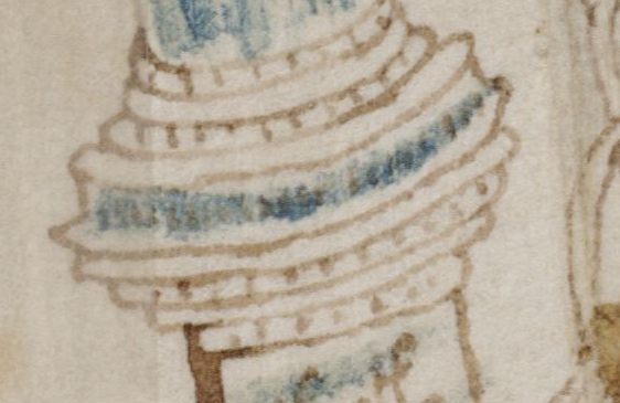 I also mentioned quite different case, in the article " SEARCH FOR HIDDEN NUMBERS IN THE VM" (see the picture above, folio f102v2). It required certain speculation what is hidden underneath and I went to extensive testing to see what could be seen on one of those seemingly decorative cylinders (of not-so-obvious purpose, some were suggested already). The find was first described by Jorge Stolfi who also suggested there might be some numbers hidden under the blue coloring, partially covering the brown scribblings in ink.