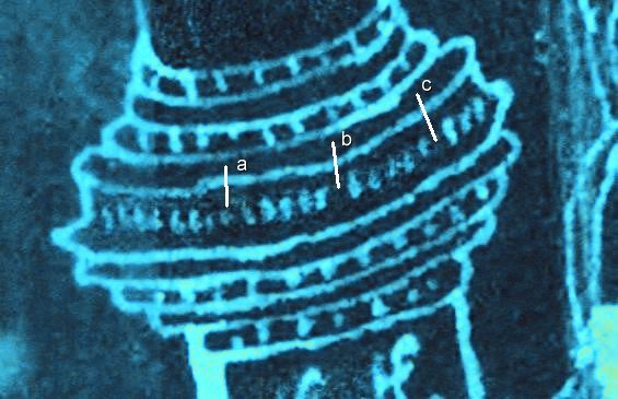 I went through several methods of color filtering (I am using here the rather inaccurate name for intensity, color and gamma manipulation, as well as other graphical tools available to me then). Several methods show undoubtedly some spots similar to Arabic digits. Again, it raised the criticism with shallow statement that "those are only the decoration doodles" or even more ludicrous "there were not supposed to be any numbers there like if that was not what we were trying to establish first place :-).