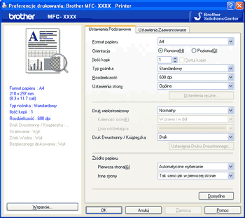 W oknie dialogowym ustawień sterownika drukarki możesz wybrać zaawansowane ustawienia drukowania.